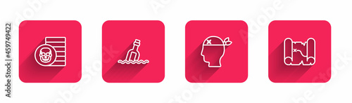 Set line Pirate coin, Bottle with message water, captain and treasure map with long shadow. Red square button. Vector