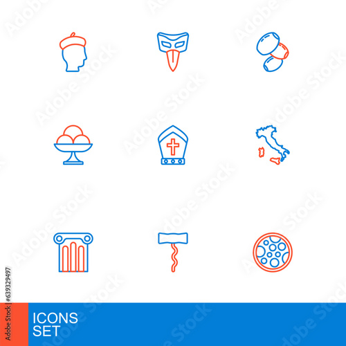 Set line Pizza, Wine corkscrew, Ancient column, Map of Italy, Ice cream the bowl, Pope hat, Olives and Carnival mask icon. Vector