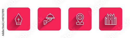 Set line Pope hat, Covered with tray of food, Location flag Italy and Milan Cathedral with long shadow. Red square button. Vector