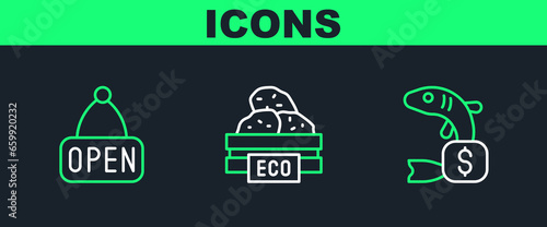 Set line Price tag for fish, Hanging sign with Open and Wooden box fruits icon. Vector