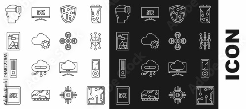 Set line Processor, Music player, Cyber security, Cloud technology data transfer and storage, 3D printer, Virtual reality glasses and Drone icon. Vector