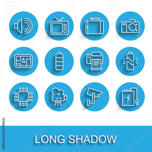 Set line Processor with microcircuits CPU, Retro cinema camera, Speaker volume, Security, Power bank charge cable, Battery level indicator, Broken battery and Printer icon. Vector