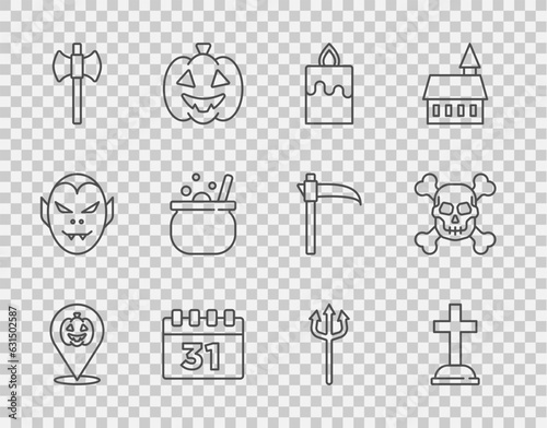 Set line Pumpkin, Tombstone with cross, Burning candle, Calendar Halloween, Wooden axe, witch cauldron, Neptune Trident and Skull crossbones icon. Vector