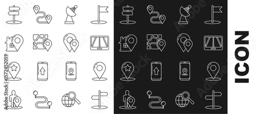 Set line Road traffic sign, Map pin, Infographic of city map navigation, Radar, Folded with location marker, pointer house, and icon. Vector