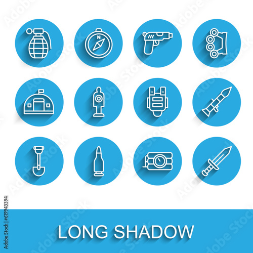 Set line Sapper shovel, Bullet, Hand grenade, Dynamite timer clock, Sword, Human target sport for shooting, Rocket launcher and Bulletproof vest icon. Vector