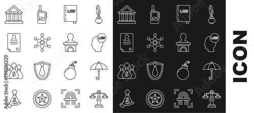 Set line Scales of justice, Umbrella, Head with law, Law book, Hexagram sheriff, Identification badge, Courthouse building and Stage stand or debate podium rostrum icon. Vector