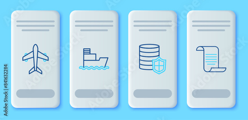Set line Ship, Money with shield, Plane and Document icon. Vector