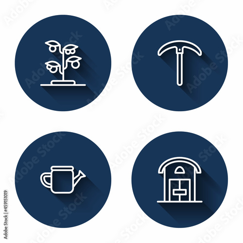 Set line Sprout, Pickaxe, Watering can and Farm house with long shadow. Blue circle button. Vector