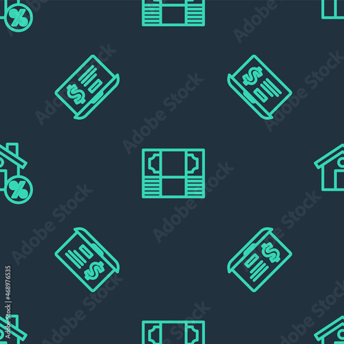 Set line Stacks paper money cash, Laptop with dollar and House percant discount on seamless pattern. Vector