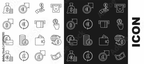 Set line Stacks paper money cash, Money exchange, Hand holding coin, Dollar plant, Coin with euro symbol, Financial growth bitcoin, bag and Credit card inserted icon. Vector