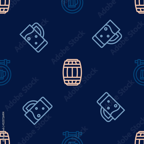 Set line Street signboard with beer, Glass of and Wooden barrel on seamless pattern. Vector