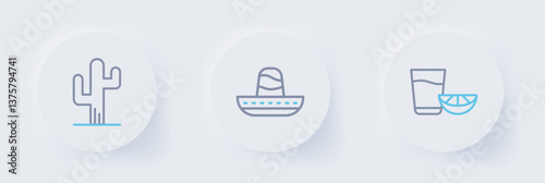 Set line Tequila glass with lemon, Mexican sombrero and Cactus icon. Vector