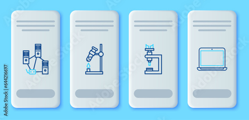 Set line Test tube flask on fire, Microscope, Computer network and Laptop icon. Vector