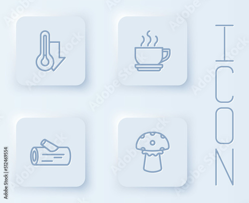 Set line Thermometer, Coffee cup, Wooden log and Mushroom. White square button. Vector