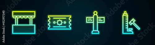 Set line Ticket box office, , Road traffic signpost and Striker attraction with hammer. Glowing neon icon. Vector