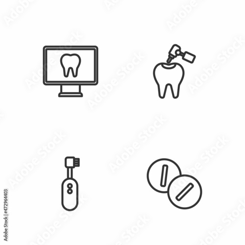 Set line Toothache painkiller tablet, Electric toothbrush, Online dental care and with caries and drill icon. Vector