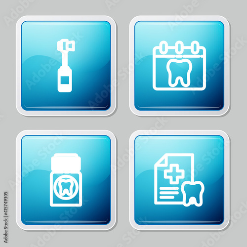 Set line Toothbrush, Calendar with tooth, Painkiller tablet and Dental card icon. Vector.