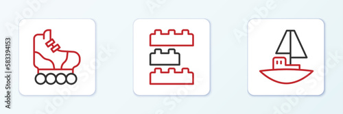 Set line Toy boat, Roller skate and building block bricks icon. Vector