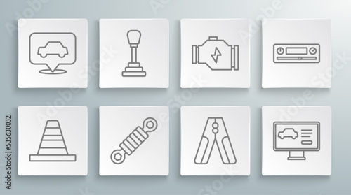 Set line Traffic cone, Gear shifter, Shock absorber, Car battery jumper power cable, Diagnostics condition of car, Check engine, Audio and service icon. Vector