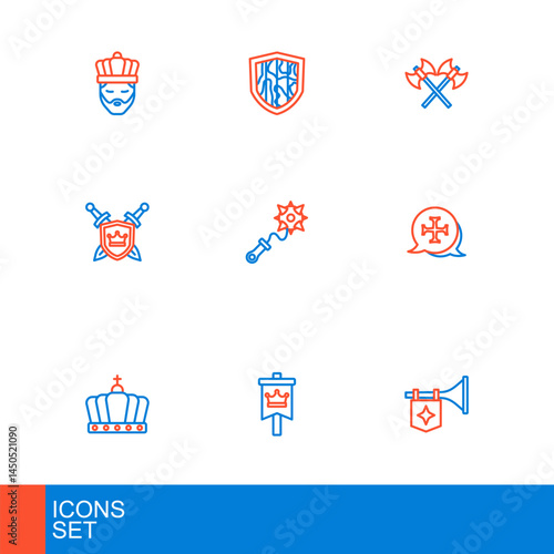 Set line Trumpet with flag, Medieval, King crown, Crusade, Shield swords, Mace spikes, Crossed medieval axes and icon. Vector