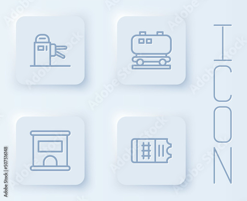 Set line Turnstile, Oil railway cistern, Ticket office to buy tickets and Train. White square button. Vector