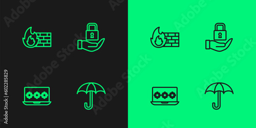 Set line Umbrella, Laptop with password, Firewall, security wall and Lock icon. Vector