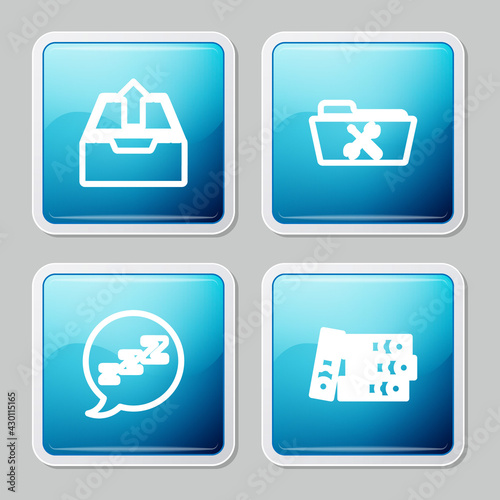 Set line Upload inbox, Folder service, Speech bubble with snoring and Office folders icon. Vector