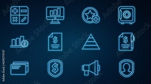 Set line User protection, Contract money and pen, Star, Pie chart infographic dollar, Calculator, Pyramid infographics and Monitor with icon. Vector