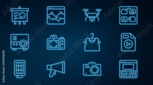 Set line Video recorder on laptop, AVI file document, Drone flying, Photo camera, Media projector, Scenario chalkboard, Sleeveless T-shirt and Music wave equalizer icon. Vector
