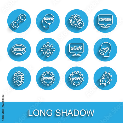 Set line Virus, Corona virus covid-19, 2019-nCoV, Face in medical protective mask and location icon. Vector