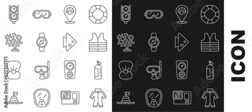 Set line Wetsuit, Aqualung, Life jacket, Scallop sea shell, Compass, Coral, Gauge scale and Fish icon. Vector