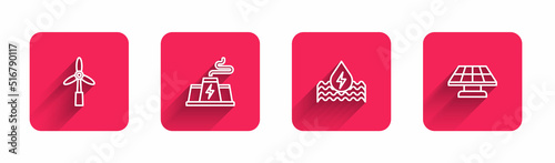 Set line Wind turbine, Power station plant factory, Water energy and Solar panel with long shadow. Red square button. Vector