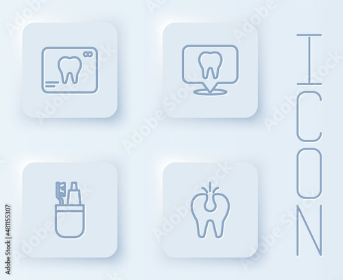 Set line X-ray of tooth, Dental clinic location, Toothbrush and toothpaste and Broken. White square button. Vector