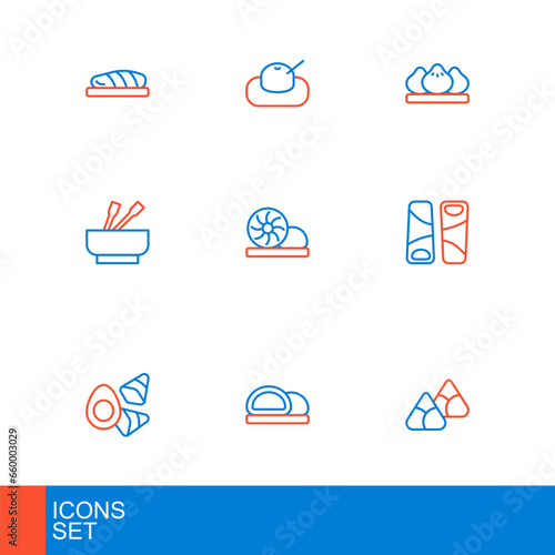 Set line Zongzi in bamboo steamer, Sushi, Chicken egg with vegerables, Guotie, Asian noodles bowl, Xiao long bao, Dumpling and Mochi icon. Vector