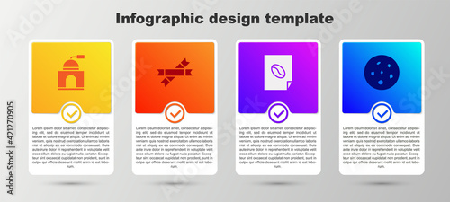 Set Manual coffee grinder, Sugar stick packets, Coffee poster and Cookie or biscuit. Business infographic template. Vector
