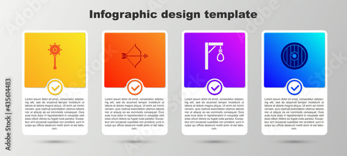 Set Medieval chained mace ball, bow and arrow, Gallows and Round wooden shield. Business infographic template. Vector