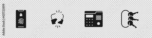 Set Mobile with fingerprint scan, Broken or cracked lock, House intercom system and Bunch of keys icon. Vector