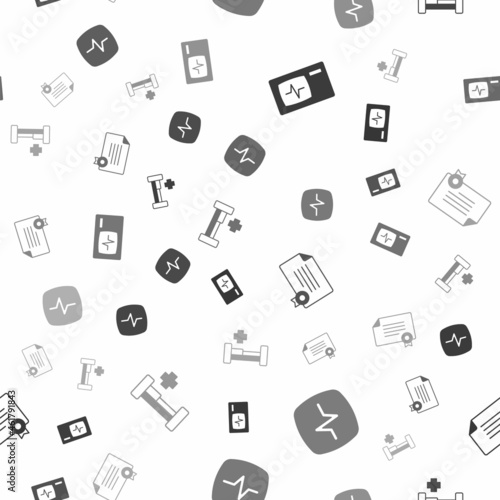 Set Monitor with cardiogram, Heart rate, Certificate template and Hospital bed on seamless pattern. Vector