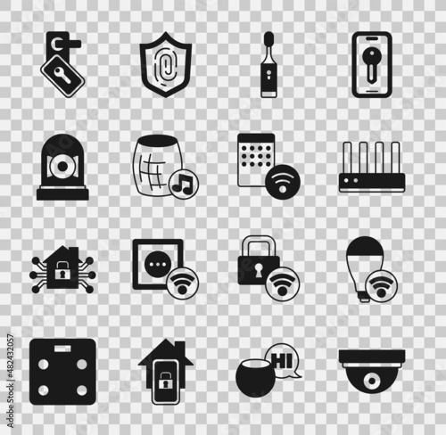 Set Motion sensor, Smart light bulb, Router and wi-fi signal, Electric toothbrush, Voice assistant, Ringing alarm bell, Digital door lock and Air humidifier icon. Vector