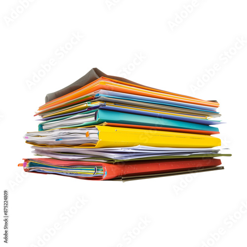set of A stack of documents, with a colorful flat file on top with a white background. The documents are stacked in three layers, on a transparent backgrounds