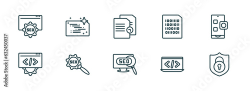 set of 10 linear icons from seo concept. outline icons such as image seo, clean code, duplicate, visibility, programming language, encryption vector