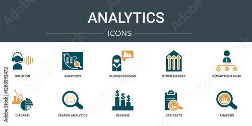 set of 10 outline web analytics icons such as solution, analytics, businesswoman, stock market, department head, diagram, search analytics vector icons for report, presentation, diagram, web design,