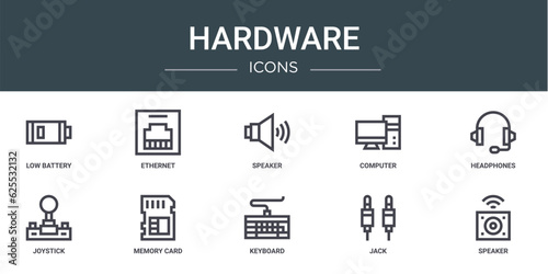 set of 10 outline web hardware icons such as low battery, ethernet, speaker, computer, headphones, joystick, memory card vector icons for report, presentation, diagram, web design, mobile app