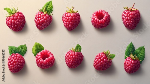 Set of 12 realistic raspberry illustrations: whole, halved, sliced, and with leaves, ideal for fresh fruit designs and illustrations.
