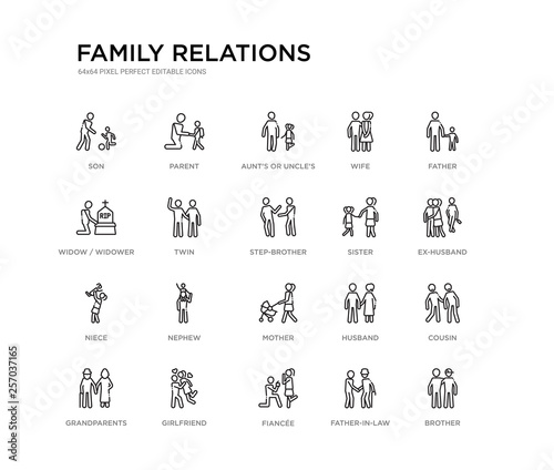 set of 20 line icons such as mother, nephew, niece, sister, step-brother, twin, widow / widower, wife, aunt's or uncle's child, parent. family relations outline thin icons collection. editable 64x64