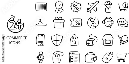 Set of 24 hand drawn outline E-commerce icons. Include Shopping, store, purchase, marketing, delivery icons. Vector illustration.