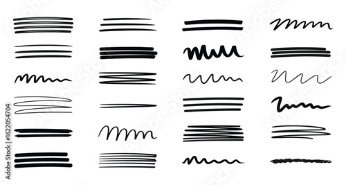Set of 25 abstract black brush strokes in grid layout, showcasing varied textures, shapes, and artistic line styles for creative design use