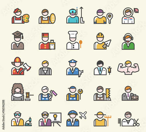 Set of 25 Minimal Solid Line Colored Professions Icons. Isolated Vector Elements.