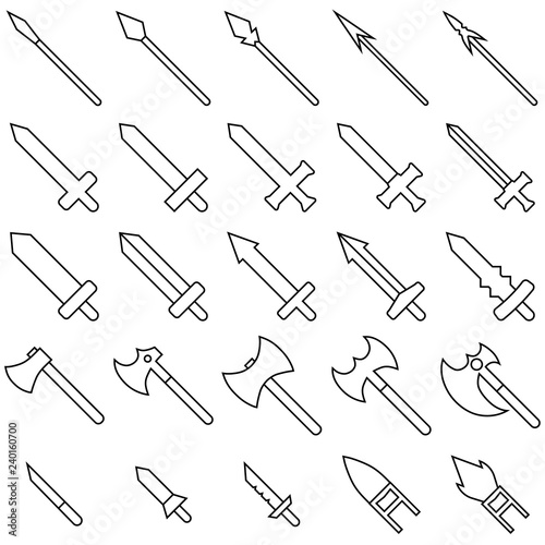 Set of 25 outline weapon icons isolated on white background. Medieval weapon silhouette. Vector illustration for your design, game, card, web.