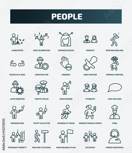 set of 25 special lineal people icons. outline icons such as landkeeper, man celebrating, man walking and smoking, goodbye, layer working, students, ticket collector, cook, man holding a flag,